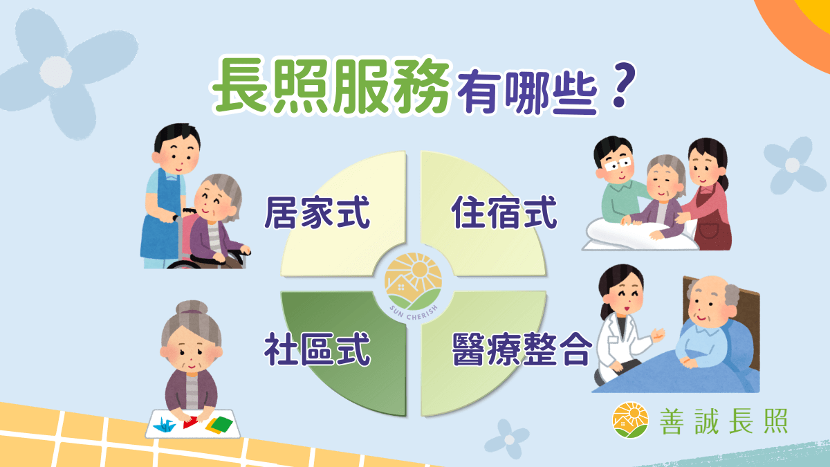 長照 3.0 最新架構中長照服務涵蓋 居家式、社區式、住宿式、醫療整合式 四大類: