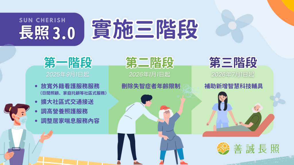 以下表格整理長照 3.0 的三個實施階段、對應時程,以及各階段的政策重點與實際影響,協助民眾快速了解制度推動節奏,以及不同時間點可預期的服務變化。